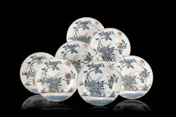 Probabile manifattura milanese, fine secolo XVIII. Gruppo di sette piatti tondi in maiolica con bordi ad orlo liscio profilati in oro, smalto azzurrato, fondi ribassati. Decorazione in rosso, blu e oro con peonie, farfalle e onde marine (d. cm 22,5 circa) (lievi difetti)
