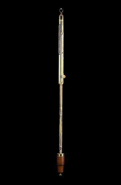 Barometro del tipo "Torricelli" con termometro, struttura in ottone e legno Epo