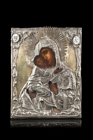 Icona ad olio su tavola raffigurante Madonna con Bambino, riza in argento dorato e sbalzato a volute e decorato agli angoli in smalti. Russia, secolo XIX, marchi non decifrati del 1858 (cm 17,5x13,5) (mancanze)