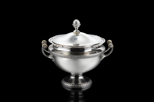 Zuppiera biansata in argento a corpo liscio di forma circolare con coperchio cimato da presa a guisa di grande pigna a tutto tondo. Bordura sagomata, decori a fiori stilizzati ed elementi in avorio nelle anse e all'attaccatura della presa. Titolo 800 (g 2185 ca.) (lievi difetti)