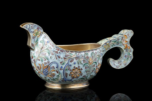Kovsh in argento smaltato a fondo verde e azzurro con decoro floreale. Marchi d
