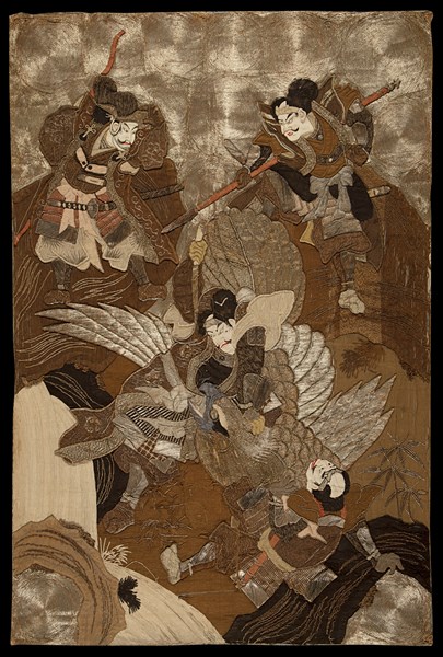 Ricamo in seta, cotone e fili d'argento applicati su tela di cotone. Giappone, seconda metà secolo XIX.