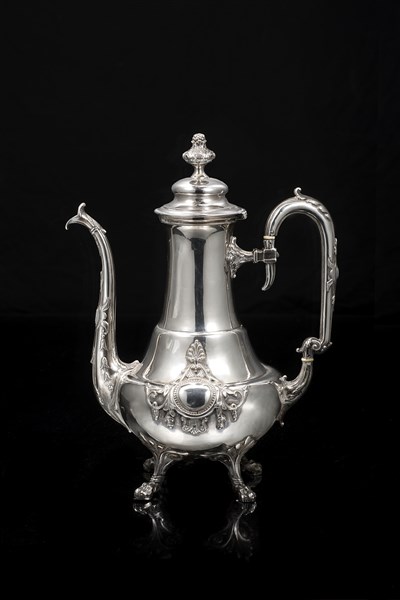 Caffettiera in argento a corpo piriforme scanalato sorretto da quattro piedi ferini con attaccature a foglie e volute. Versatoio decorato a campanule e ansa di forma mossa. Francia, 1832-1840. Argentiere Jean Francois Veyrat (h. cm 29) (g 647 ca.) (difetti)