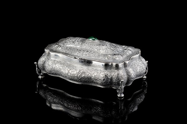 Scatola in argento decorato a volute fogliate, coperchio centrato da malachite