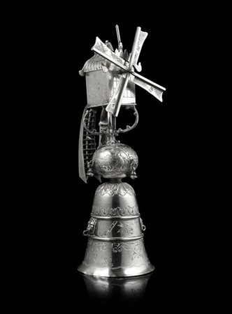 Toys in argento a forma di mulino con corpo cesellato a paesaggi con figure, volute e cherubini (h. cm 20) (g 250 ca.) (difetti e mancanze)