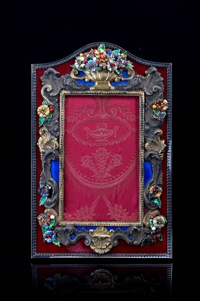 Cornice porta foto in argento, smalto e vermeille decorata a volute fogliate e in policromia a fiori (difetti)