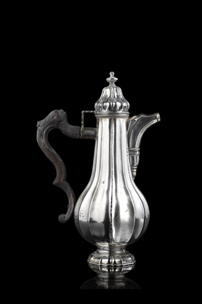 Caffettiera in argento con corpo costolato, presa a trottola e ansa a volute in legno ebanizzato. Marchi di imitazione (g lordi 940 ca.) (difetti)