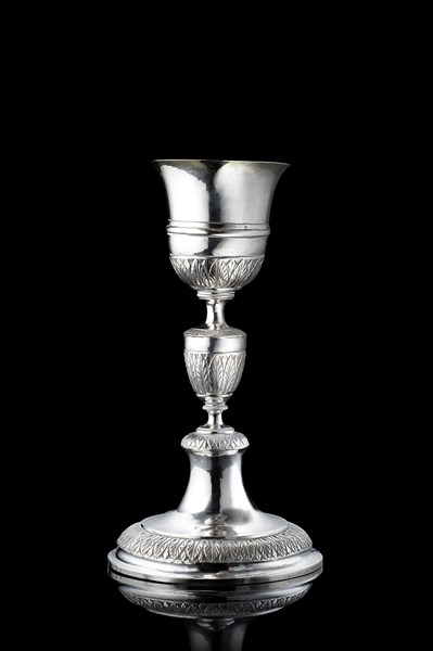 Calice in argento con fusto a balaustro, sbalzato a foglie d'acanto e palmette.