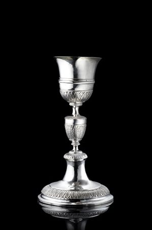 Calice in argento con fusto a balaustro, sbalzato a foglie d'acanto e palmette. Interno in vermeille. Nizza, fine secolo XVIII (h. cm 24,5) (g 380 ca.)