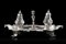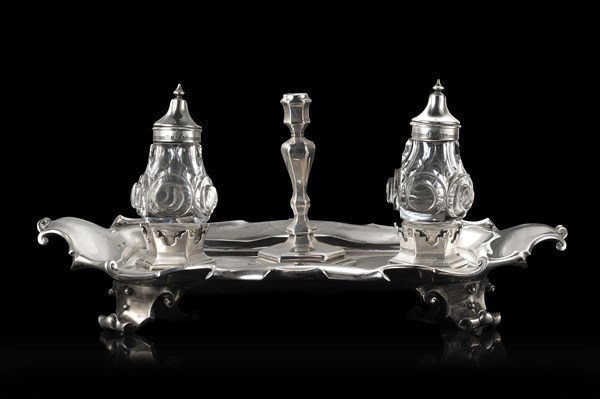 Calamaio in argento con vasca di forma sagomata, vaschette in vetro con al centro candeliere. Londra, 1854 (g 860 ca.) In custodia marcata Bulgari