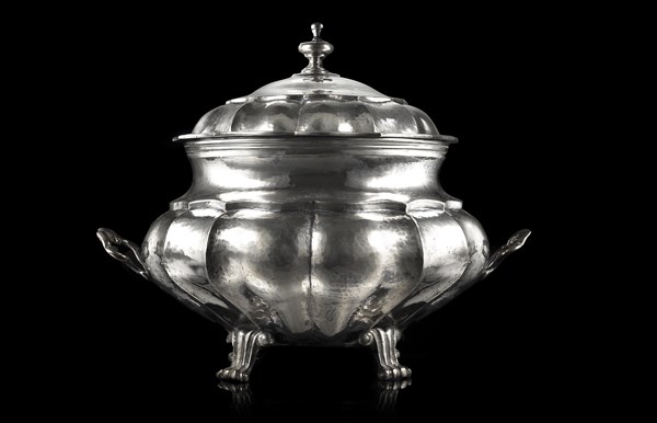 Zuppiera biansata in argento martellato a corpo costolato poggiante su tre pied