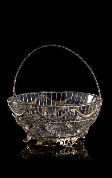 Centrotavola in vermeille cesellato a festoni e fiori con bordure cordonate, poggiante su quattro piedini a ricciolo. Vasca in vetro. Marchi di Londra, 1729 (h. cm 12 x d. 28) (g 700 ca.) (difetti)