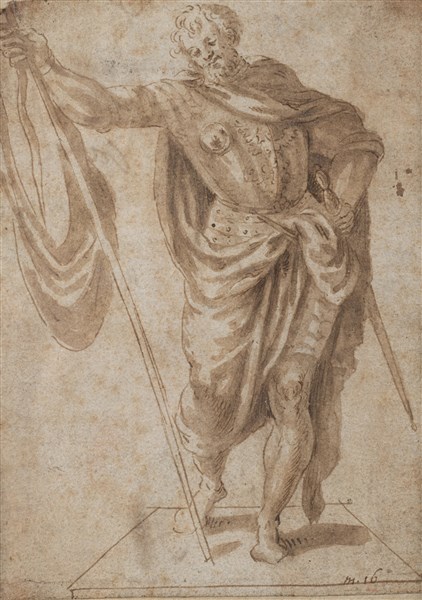 Lotto 590 | Artista del secolo XVII Figura virile con stendardo Penna e inchiostro bruno,
