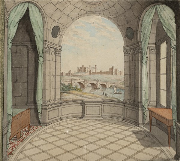 Artista della fine del secolo XVIII Interno con scorcio di paesaggio Penna e i