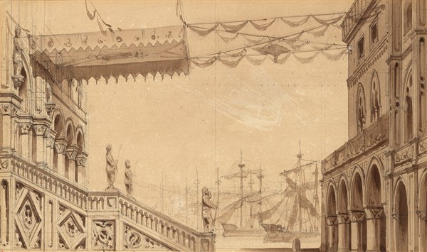 Scenografo del secolo XIX Scenografia con edifici e porto Penna e inchiostro b