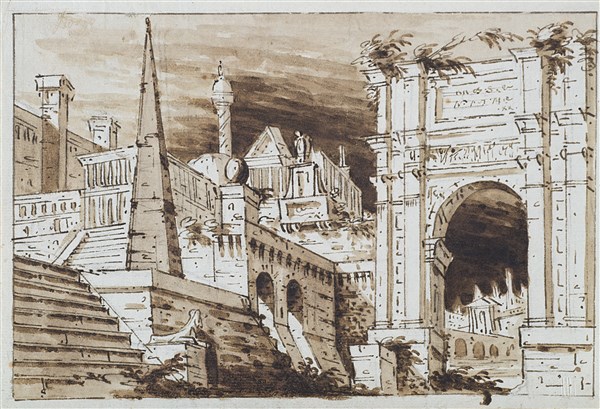 Pietro Gonzaga (attr.) Scenografia: Ruderi romani, scalone e obelisco Penna e i