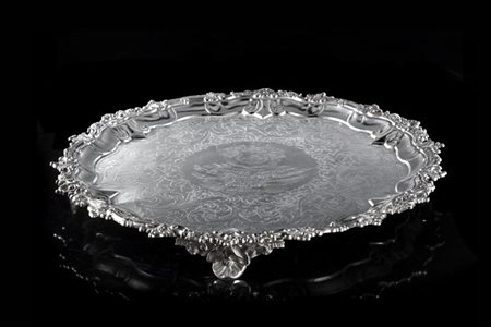 Salver in argento decorato a motivi floreali con incisione commemorativa nel cavetto. Edimburgo, 1836. Argentiere Elder & co. (g 1400 ca.)