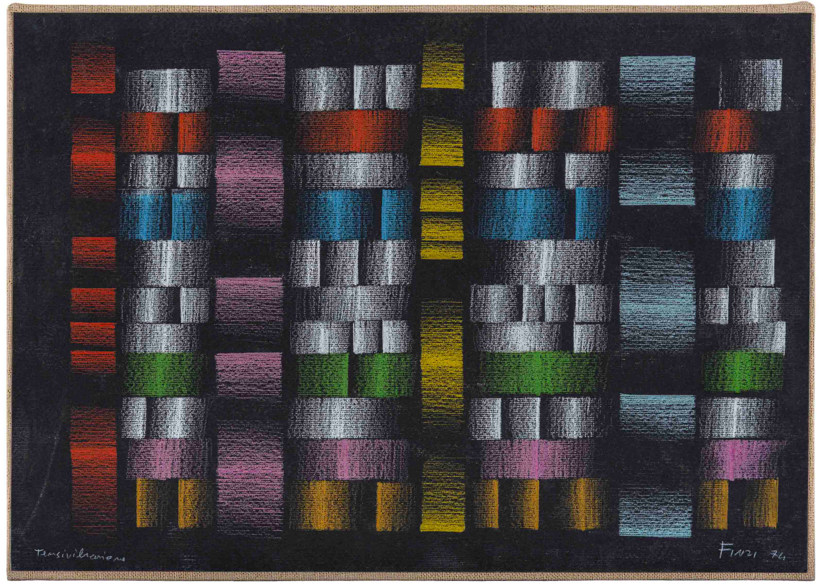 ENNIO FINZI(1931)Tensivibrazione1974Pastello su cartoncino nero applicato su tela36 x 51 cmFirmato e datato in basso a destra, titolato in basso a sinistraPROVENIENZA:Collezione privata, Vicenza