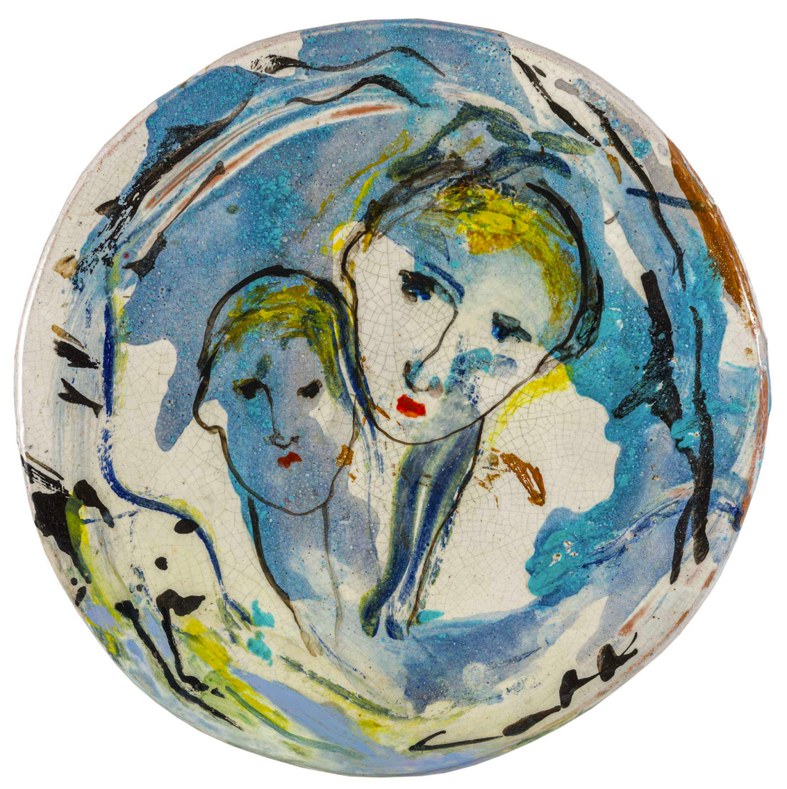 ERNESTO TRECCANI(1920 - 2009)Senza titoloTerracotta maiolicata decorata a mano, pezzo unicoDiametro: 38 cmOpera accompagnata da autentica su fotografia rilasciata da Giuseppe RossiconePROVENIENZA:Collezione privata, Milano