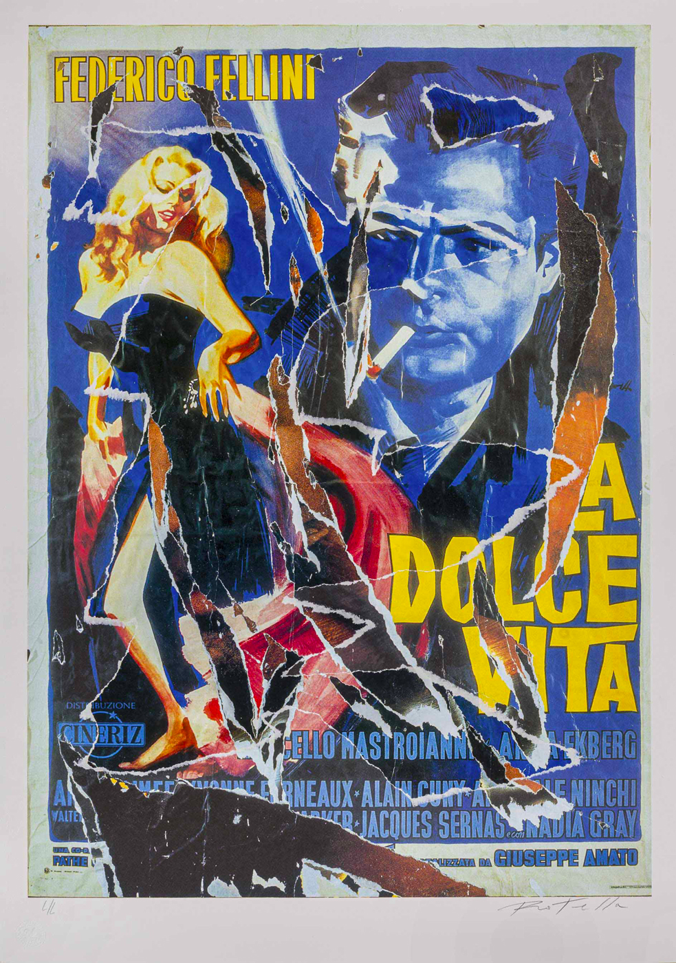 MIMMO ROTELLA(1918 - 2006)La dolce vitaSeridÈcollage, es. L/L su una tiratura di 125 esemplari in numeri arabi, 50 in numeri romani e 20 prove d'artista, Edizioni Fondazione Rotella, Milano (timbro a secco)100 x 70 cmFirmato a matita in basso a destra, numerato in basso a sinistraPROVENIENZA:Collezione privata, Monza e BrianzaBIBLIOGRAFIA:E. Pontiggia, 'Mimmo Rotella: multipli dÈcollages', Silvana Editoriale, Cinisello Balsamo, 2004, p. 82 (ill.)