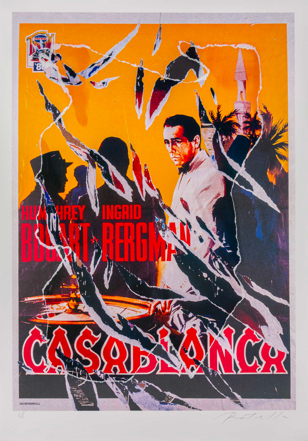 MIMMO ROTELLA(1918 - 2006)CasablancaSeridÈcollage, es. L/L su una tiratura di 125 esemplari in numeri arabi, 50 in numeri romani e 20 prove d'artista, Edizioni Fondazione Rotella, Milano (timbro a secco)100 x 70 cmFirmato a matita in basso a destra, numerato in basso a sinistraPROVENIENZA:Collezione privata, Monza e BrianzaBIBLIOGRAFIA:E. Pontiggia, 'Mimmo Rotella: multipli dÈcollages', Silvana Editoriale, Cinisello Balsamo, 2004, p. 66 (ill.)