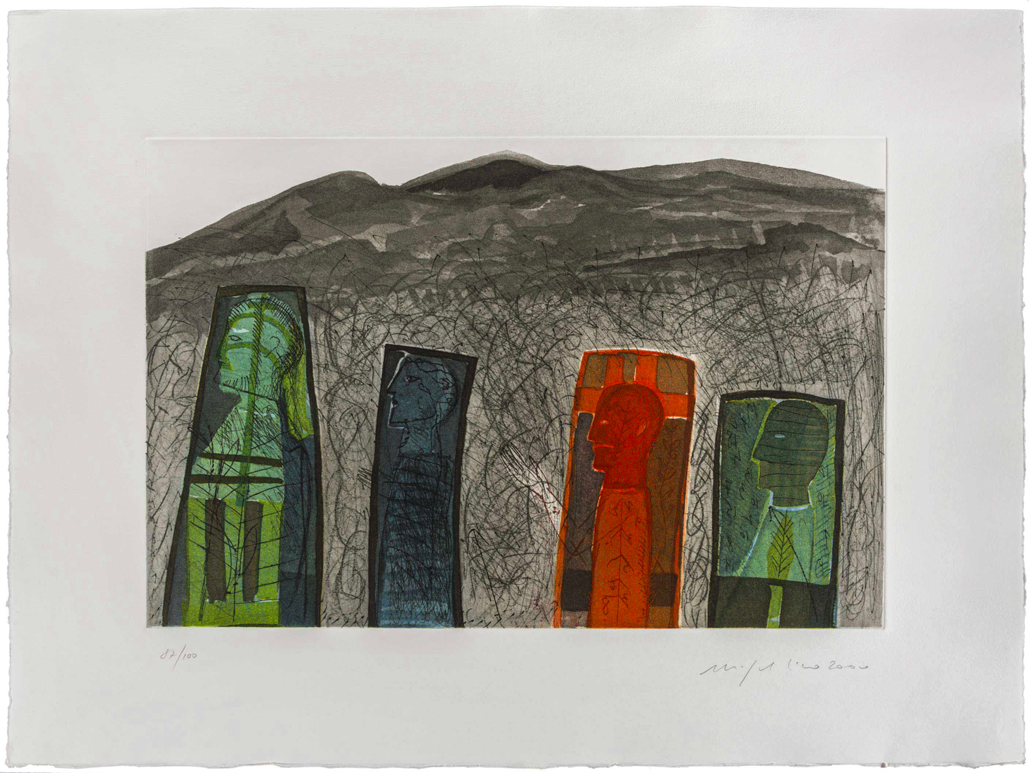 MIMMO PALADINO(1948)Sguardo a destra2000Acquaforte e acquatinta a colori su carta, es. 87/10039 x 59 cm (lastra)60 x 81 cm (foglio)Firmata e datata a matita in basso a destra, numerata in basso a sinistra
