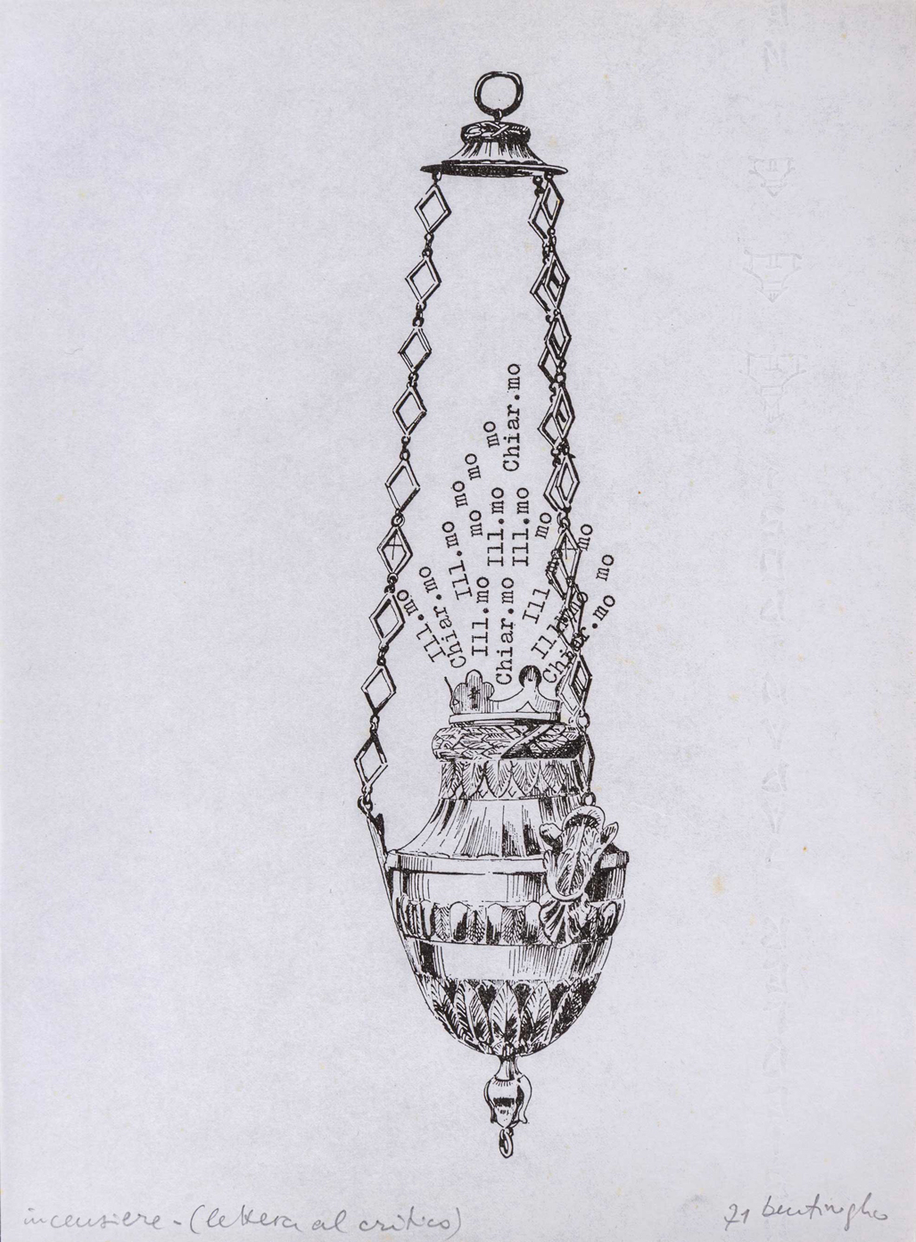 MIRELLA BENTIVOGLIO(1922 - 2017)Incensiere (lettera al critico)1971Stampa litografica su carta Japon, es. non numerato29,9 x 22 cmFirmata e datata a matita in basso a destra, titolata in basso a sinistraPROVENIENZA:Collezione privata, Milano