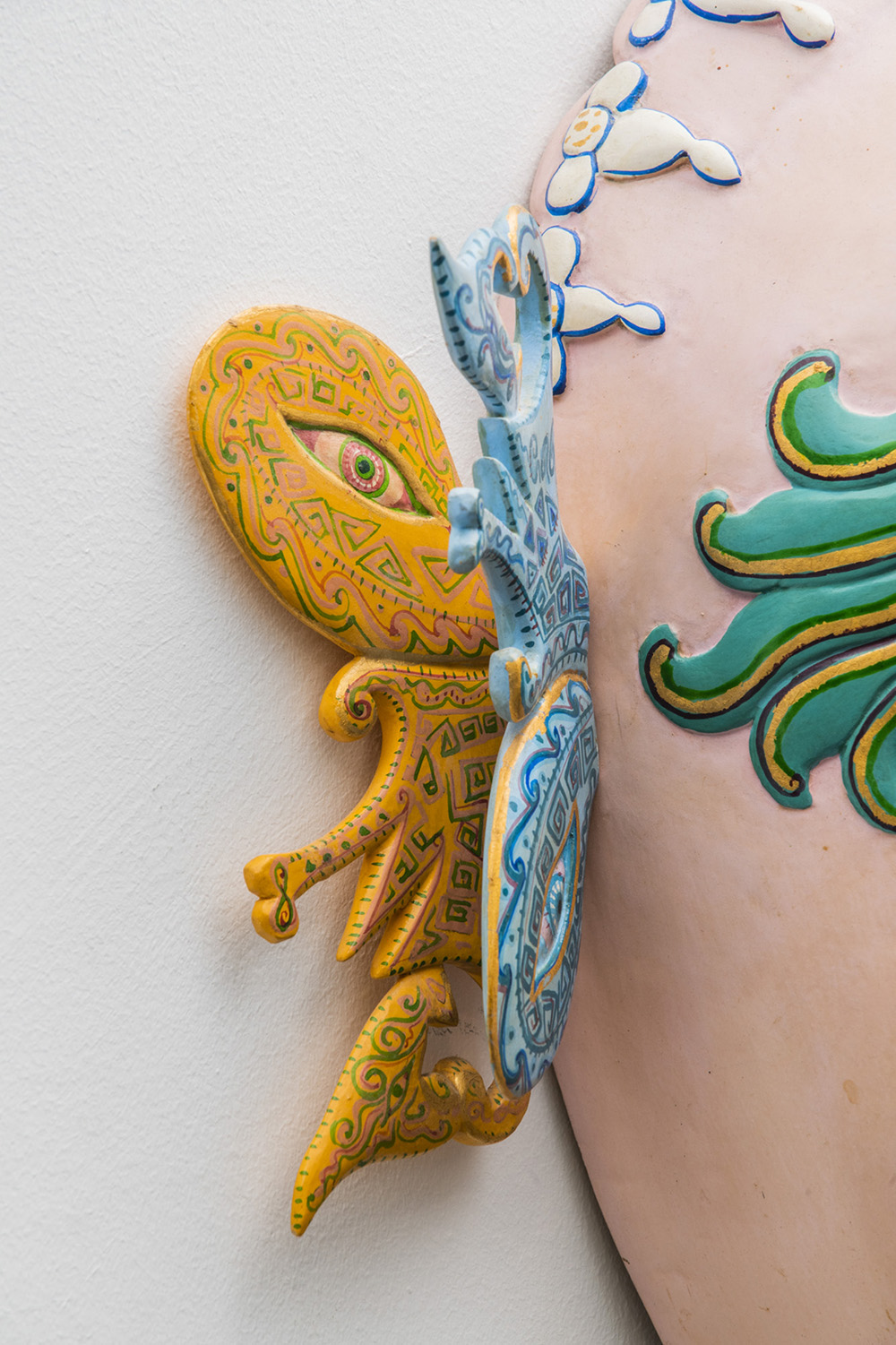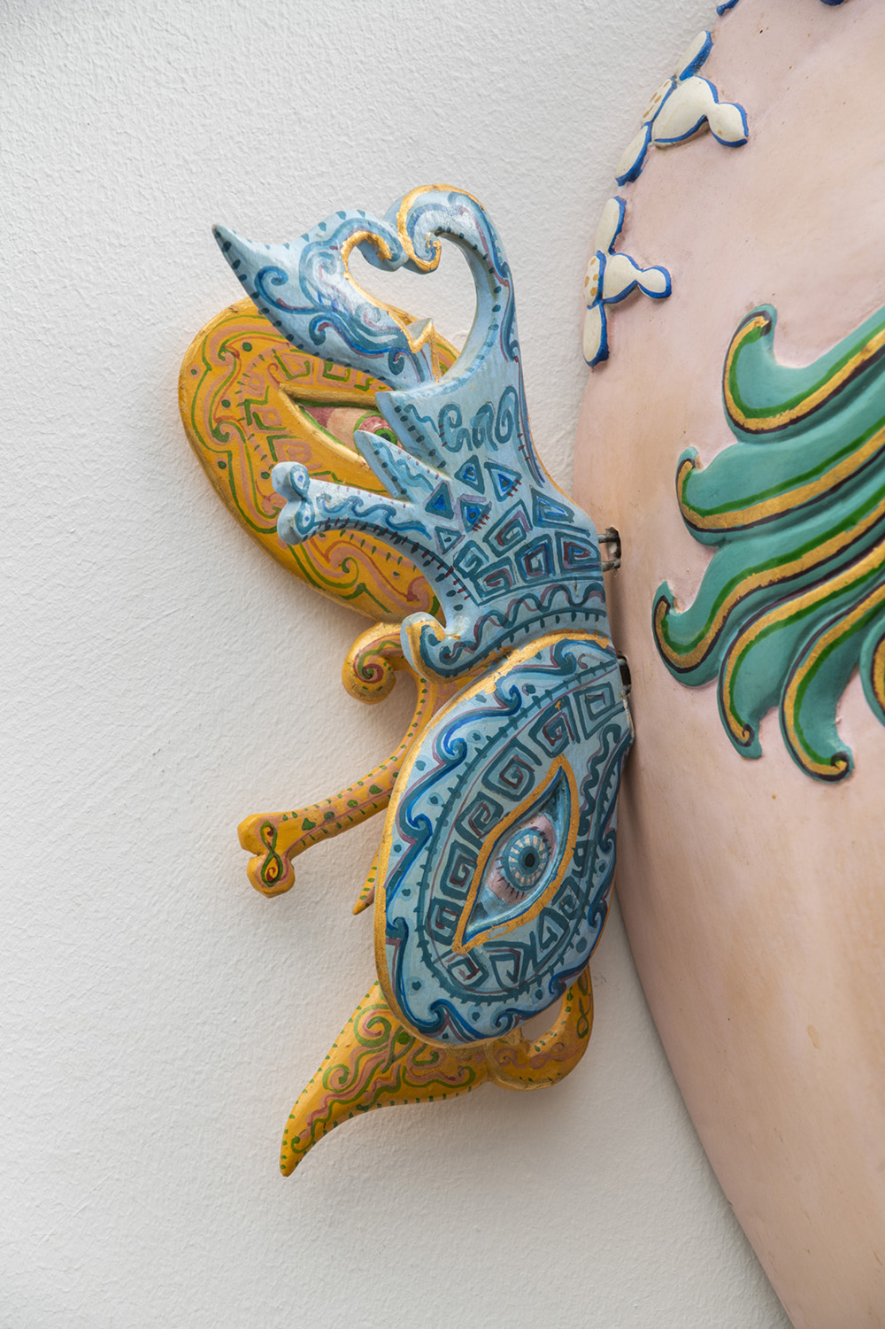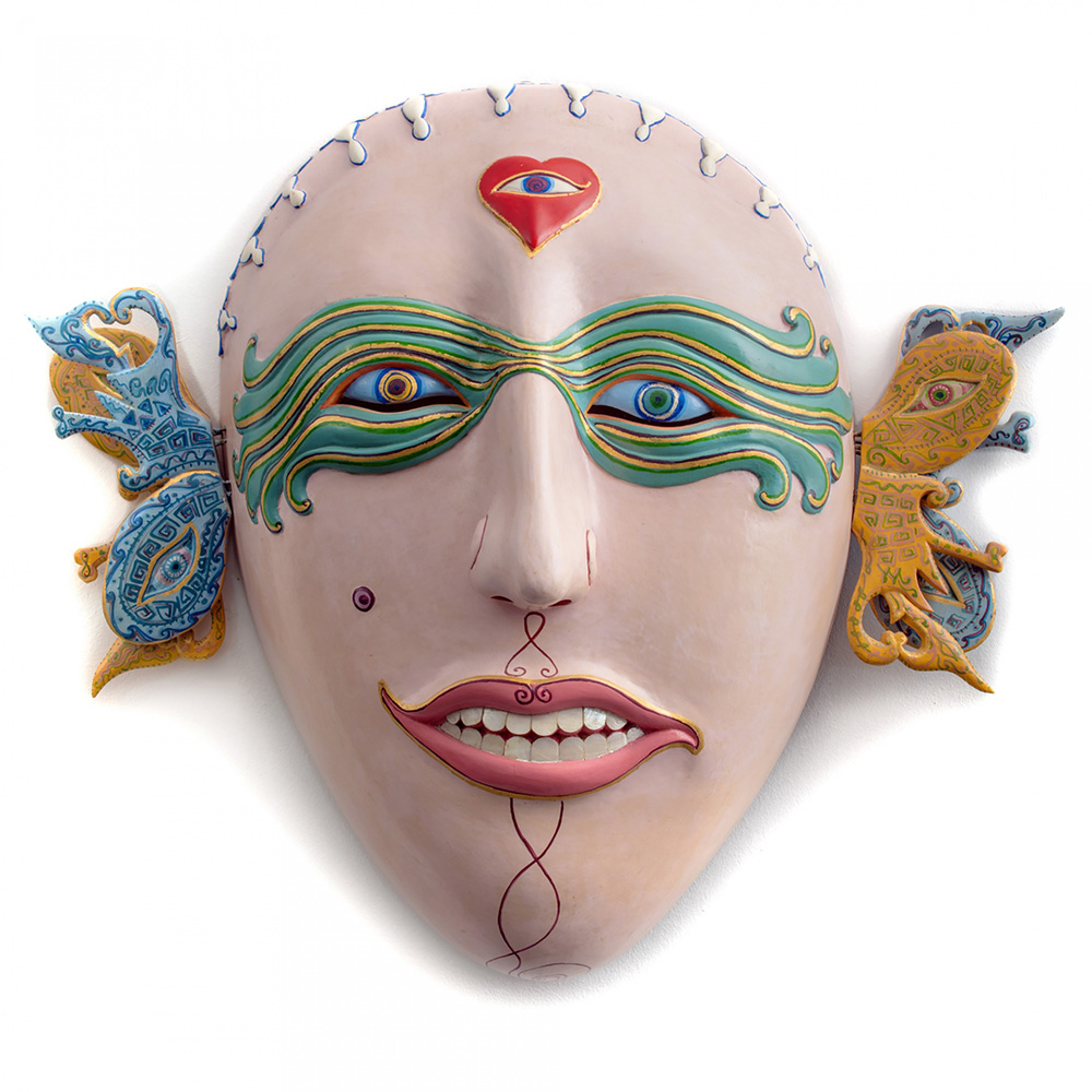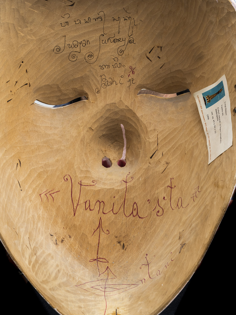 tecnica Maschera in legno di Pule dipinto a colori naturali e inserti in madreperla