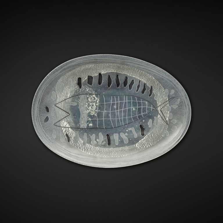 Piatto ovale iridato con decoro di pesce stilizzato eseguito alla moletta 1952.