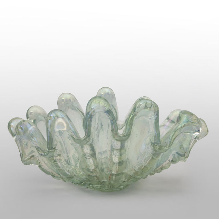 Una coppa in forma di conchiglia in cristallo iridato circa 1942.