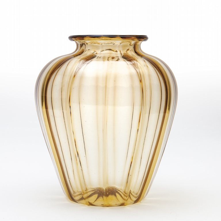 Un vaso costolato in vetro soffiato trasparente ambrato anni '20.
