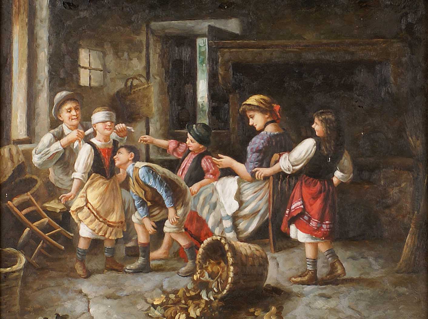 SCUOLA ITALIANA XX Sec. "La mosca cieca", olio su tela, entro cornice in legno Dim. 30x40 cm.