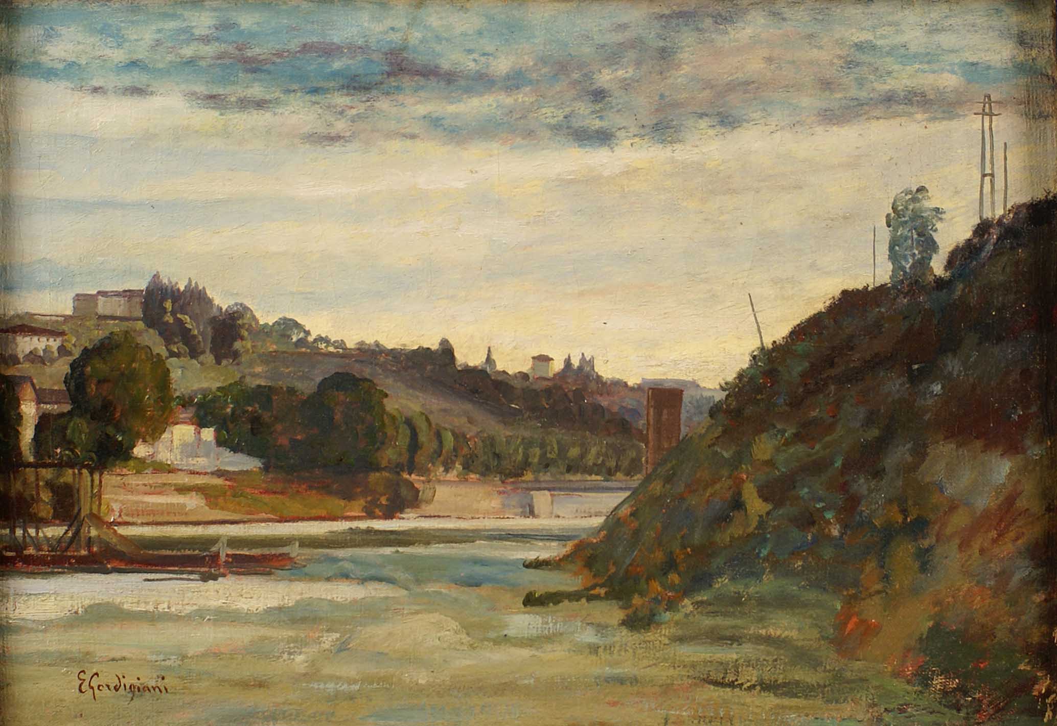EDOARDO GORDIGIANI Firenze 1867-1961 "Paesaggio fluviale", olio su tela, firmato in basso a sinistra, entro cornice Dim. 34x50 cm.