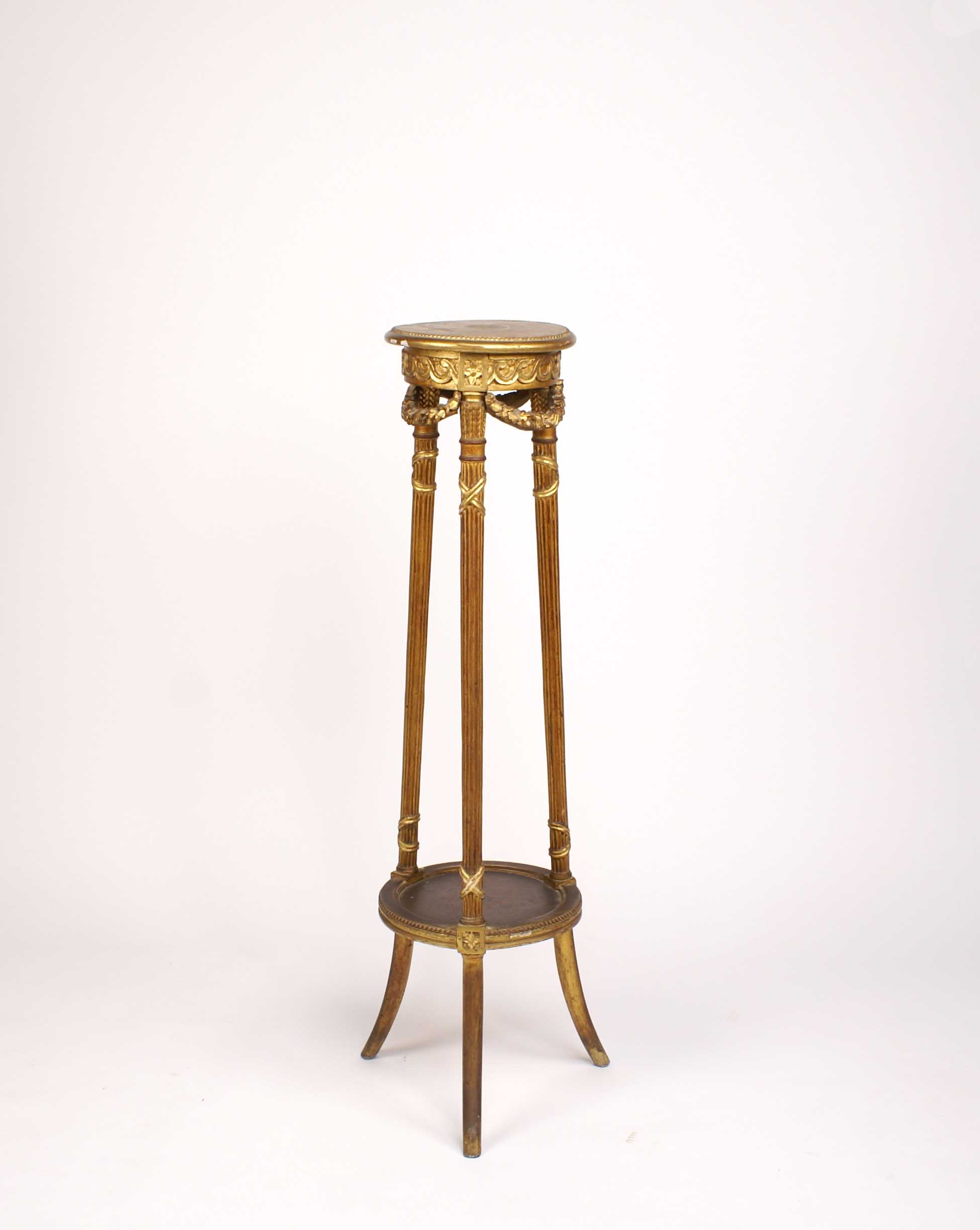 BASE PORTAVASO Francia fine del XIX Sec. In legno dorato ed intagliato, decorata a motivi di ghirlande di fiori, piano circolare poggiante su tre sostegni riuniti da un ulteriore ripiano H. 116 cm.
