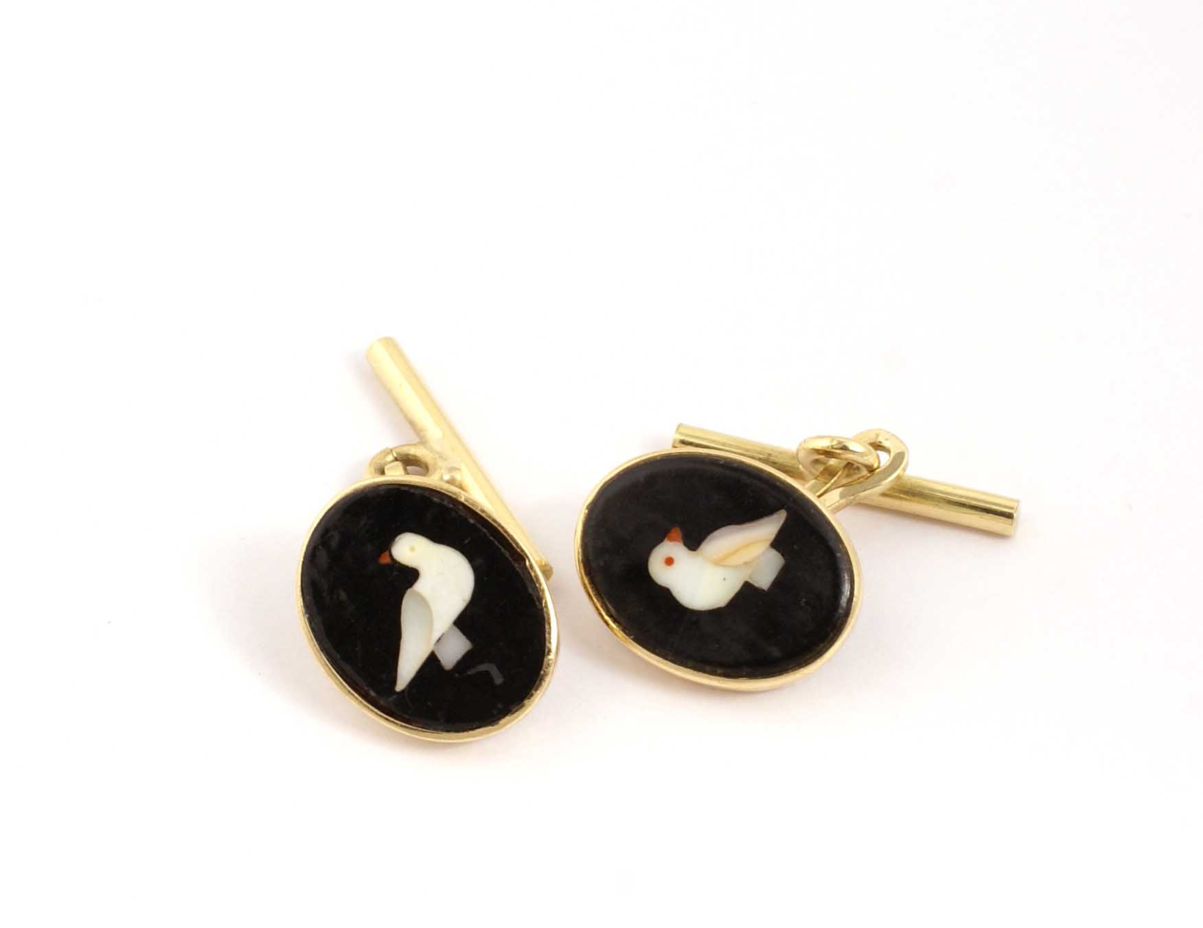 GEMELLI OVALI IN ORO GIALLO 18KT E pietre dure raffiguranti volatili Peso 6,4 gr.