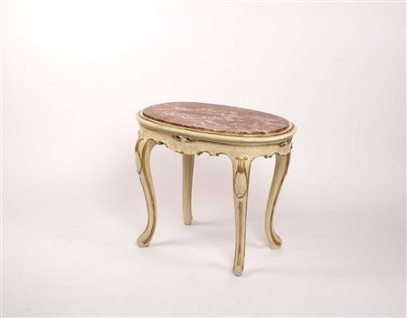 TAVOLINO BASSO IN LEGNO LACCATO Italia, vecchia manifattura Parzialmente dorato, piano ovale in marmo rosso, poggiante su gambe di linea arcuata Dim. 56x70 cm.