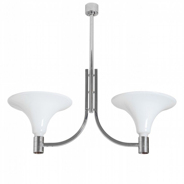 Chrome-plated steel and opaline glass.