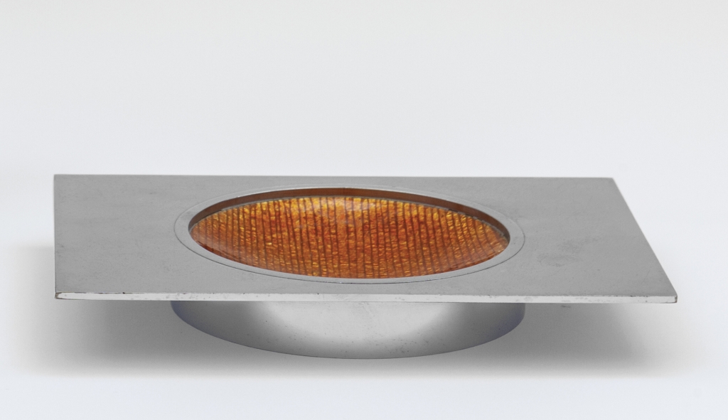 Acciaio cromato rame con applicazione di foglia d'argento trattata al bulino e smaltata.