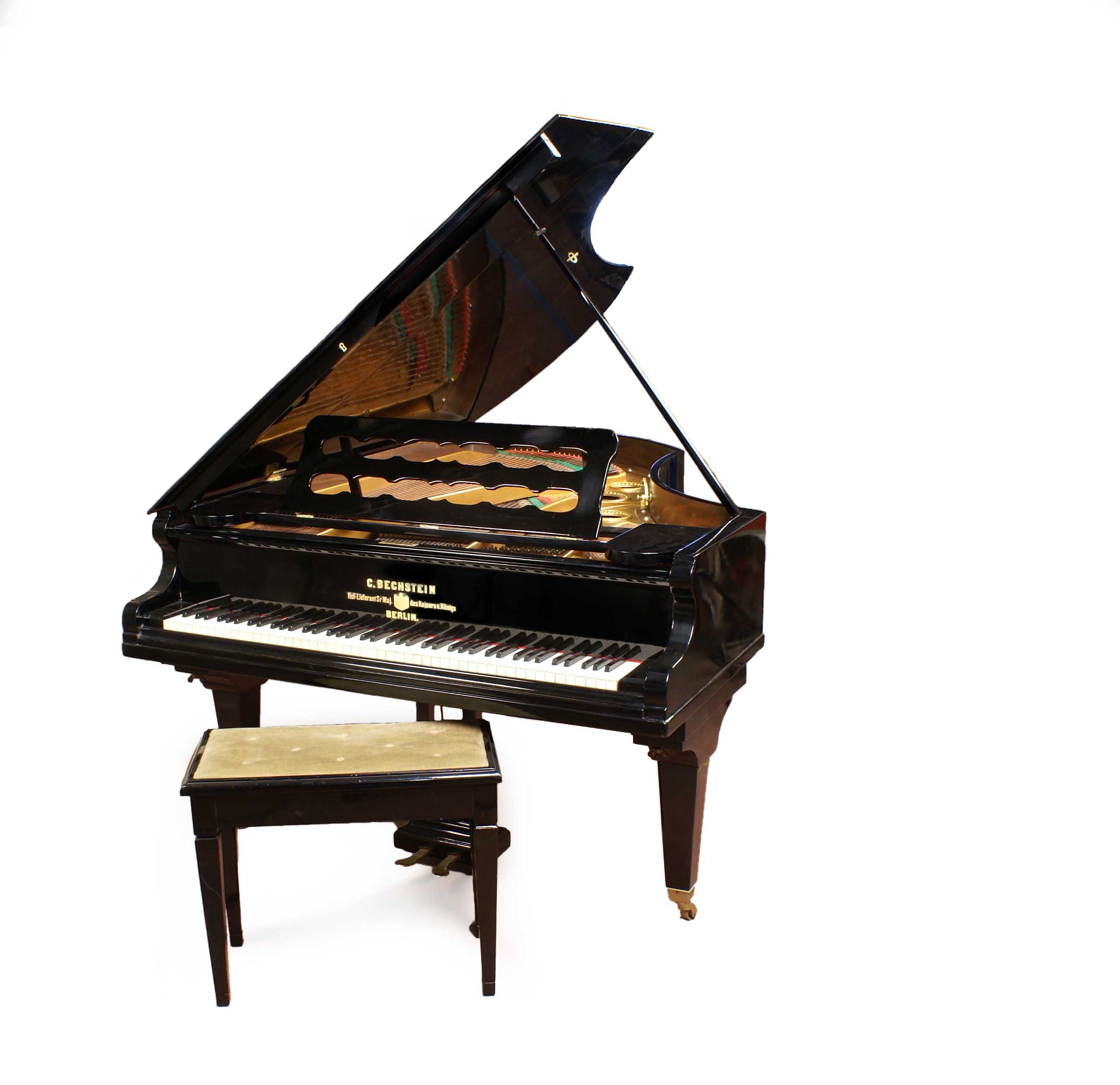PIANOFORTE BECHSTEIN NERO 3/4 DI CODA Berlino 1890-1900 Meccanica a doppia ripetizione, molle Hertz, tastiera 88 note in avorio, completamente revisionato e accordato, con relativo sgabello Dim. 99x220x146 cm.