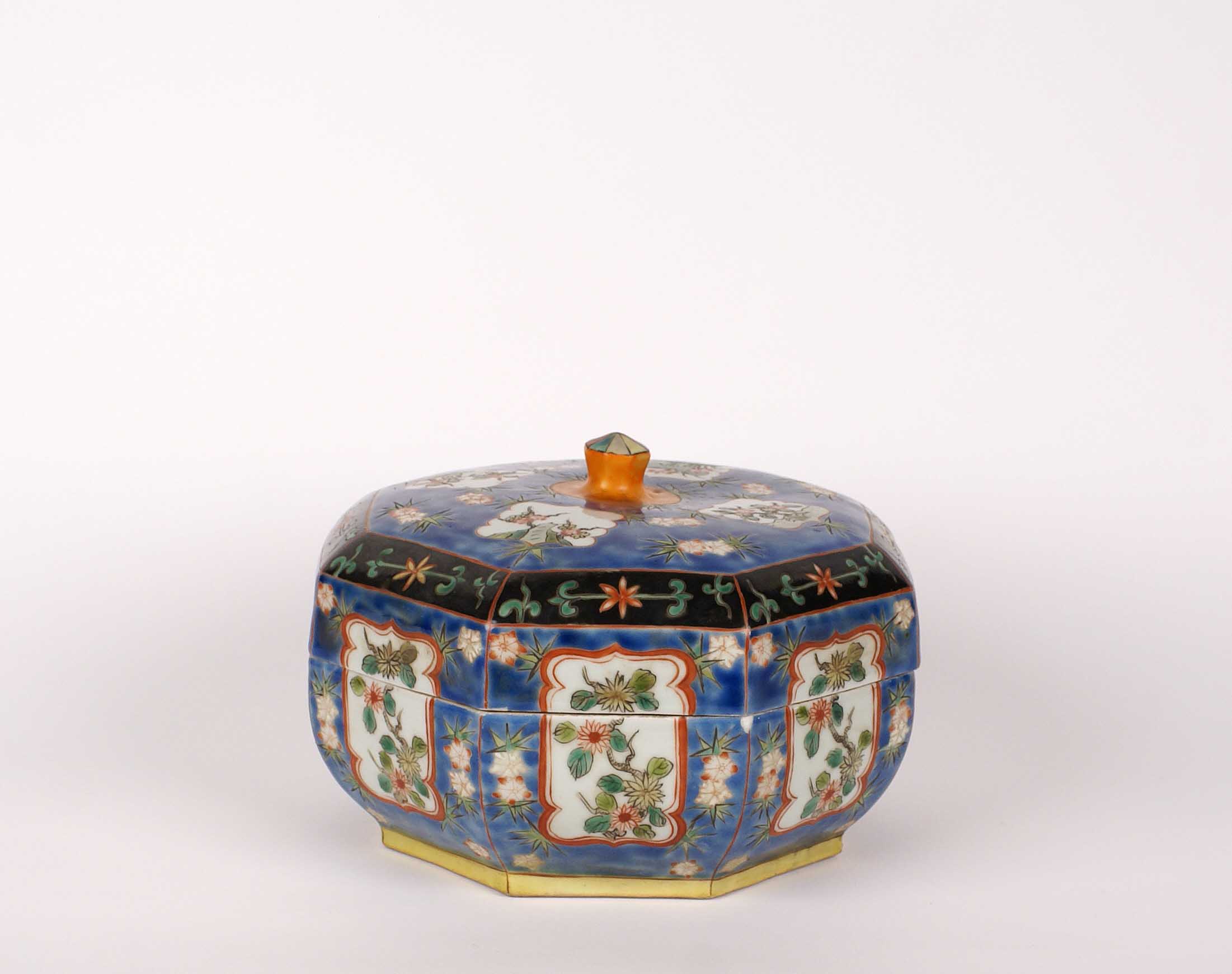 SCATOLA OTTAGONALE Cina In porcellana dipinta in policromia a motivi floreali...