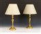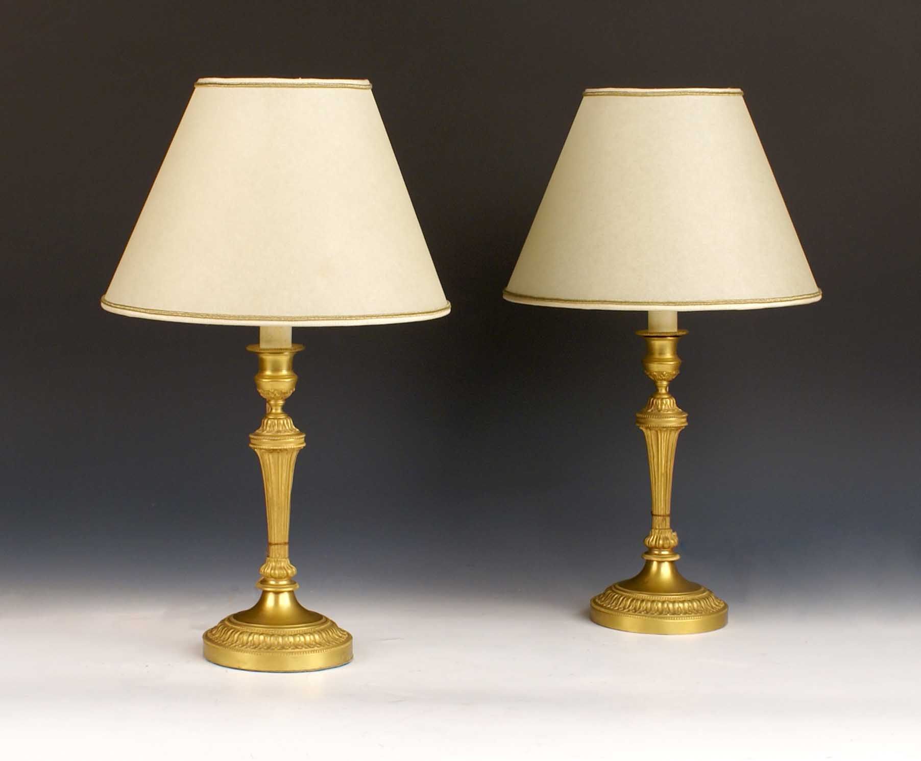 COPPIA DI CANDELIERI ELETTRIFICATI Francia, vecchia manifattura In bronzo dorato completi di paralume H. 46 cm.