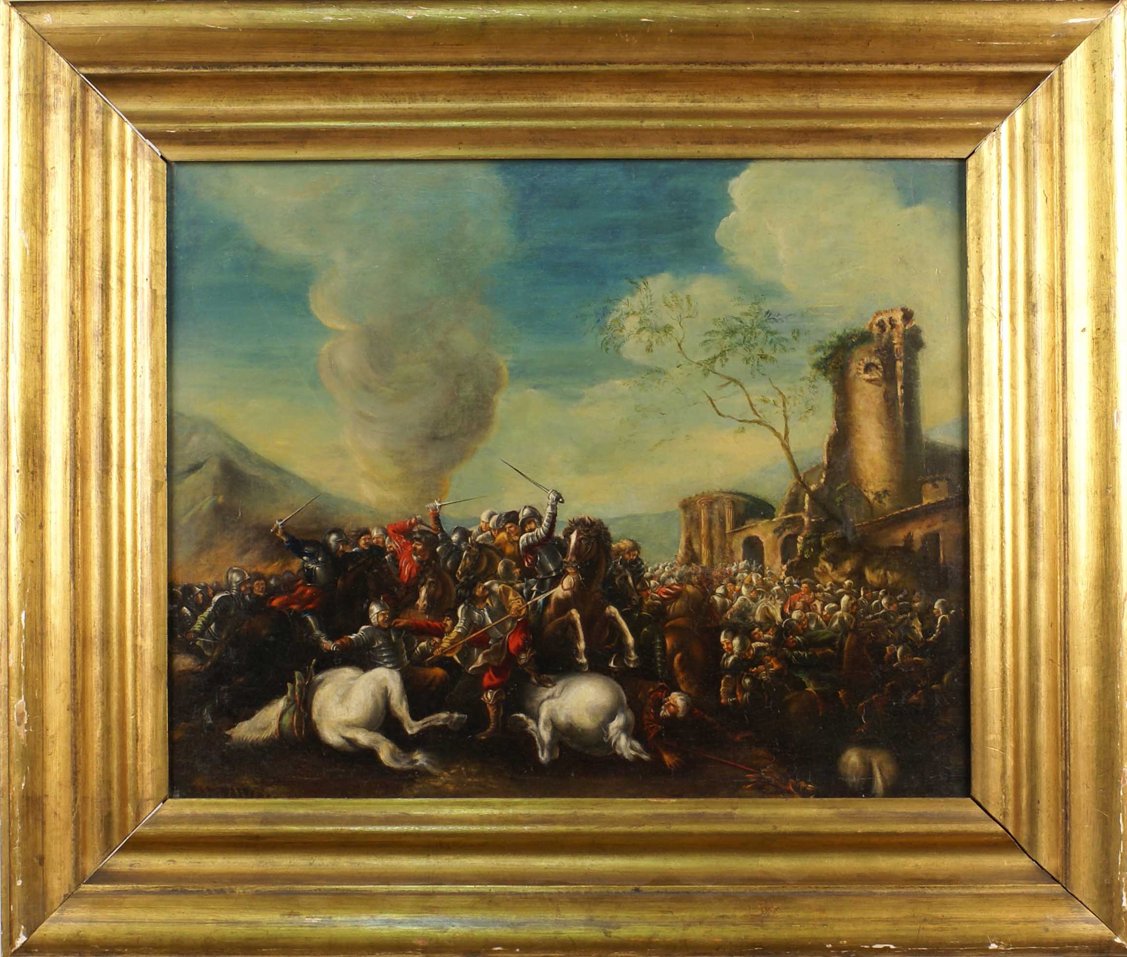 SALVATOR ROSA, SEGUACE DI Italia, XIX Sec. "Scena di battaglia", olio su tela, entro cornice Dim. 62x50 cm.