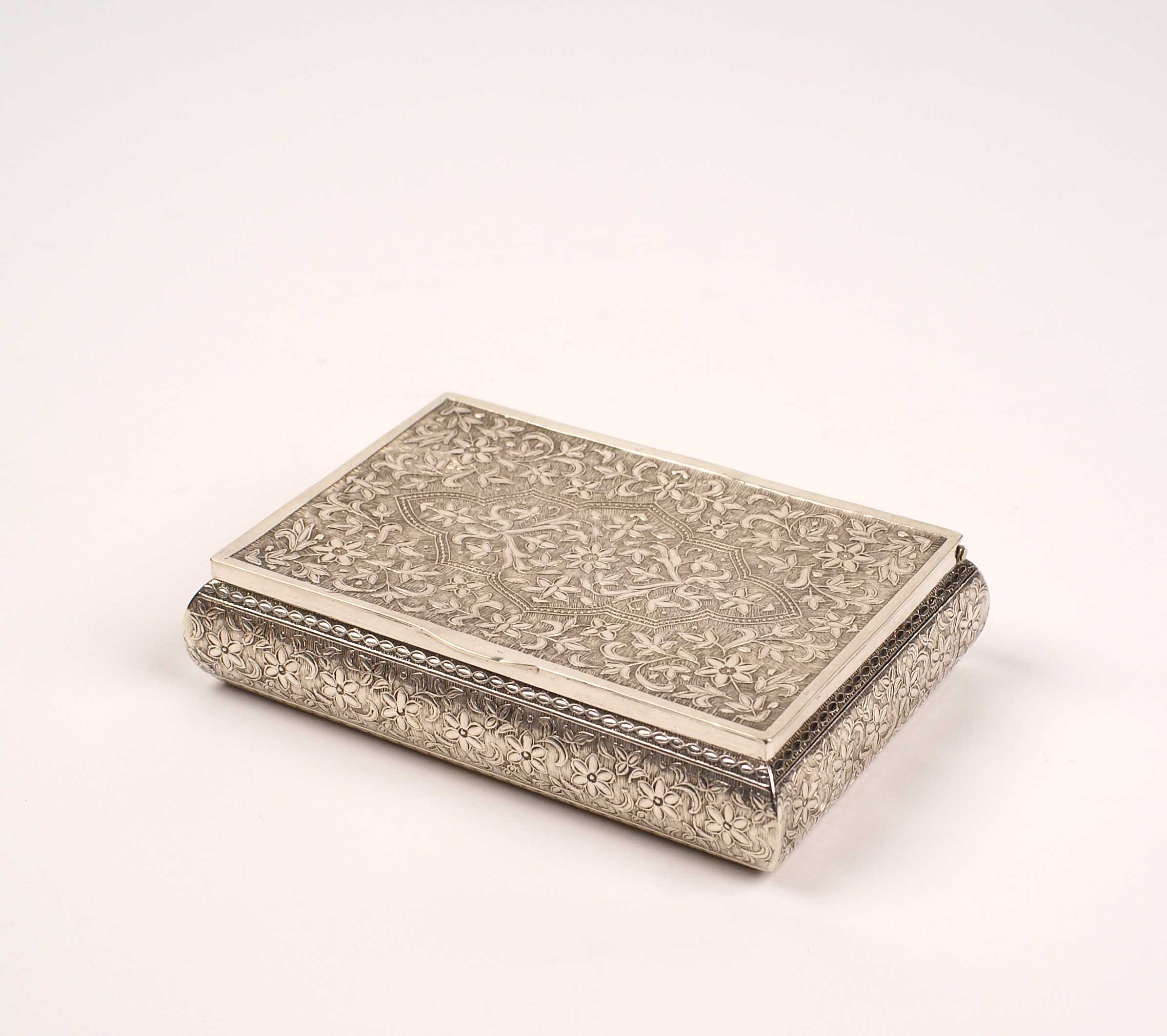 SCATOLA IN ARGENTO XIX Sec. Interamente incisa a motivo floreale, cm. 3x13x9 Peso 243 gr.