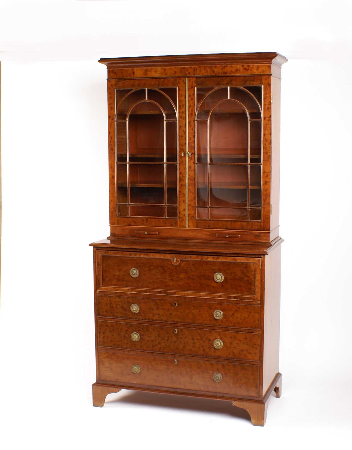 BOOKCASE IN MOGANO E MOGANO FIORITO Inghilterra XIX Sec. Parte superiore con due sportelli a vetro e ripiani all'interno, parte inferiore a quattro cassetti di cui il primo a calatoia rivestita in pelle con tiretti e scomparti vari, piedi a mensola Dim. 217x110x56 cm.