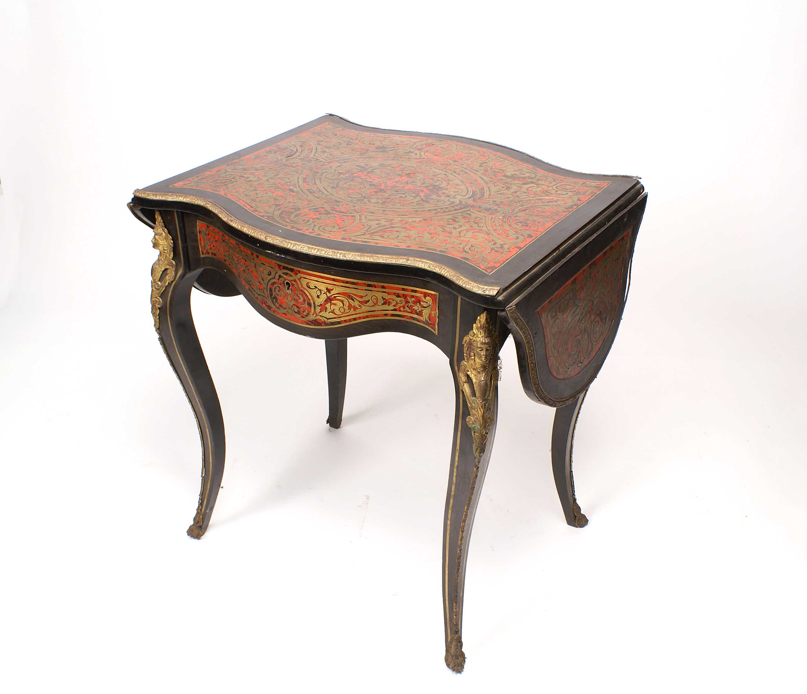 TAVOLINO A BANDELLE Francia Napoleone III In legno ebanizzato ed intarsiato in ottone e tartaruga a motivi floreali e di volute alla maniera Boulle, con applicazioni in bronzo dorato, (difetti e mancanze) Dim. 75x115x58 cm.