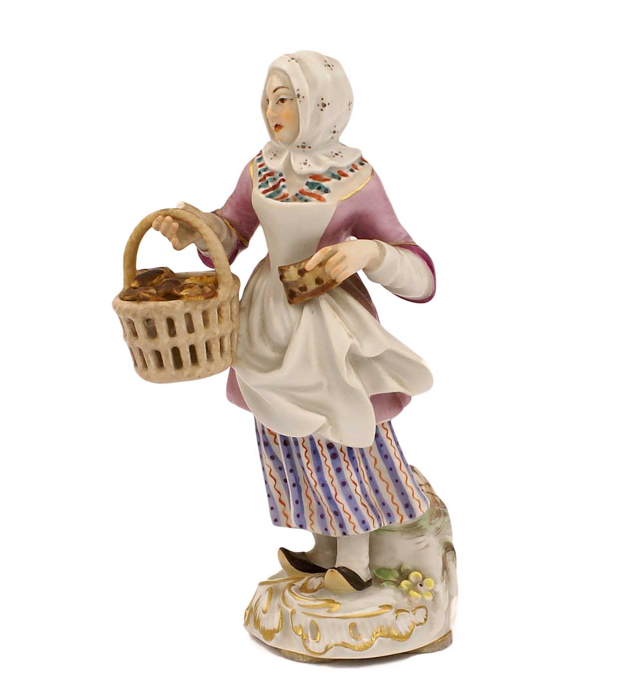 FIGURA IN PORCELLANA MEISSEN prima metà del XX Sec. Dipinta in policromia a raffigurare una venditrice di pane e poggiante su base a roccailles (lievi difetti) H. 14 cm.