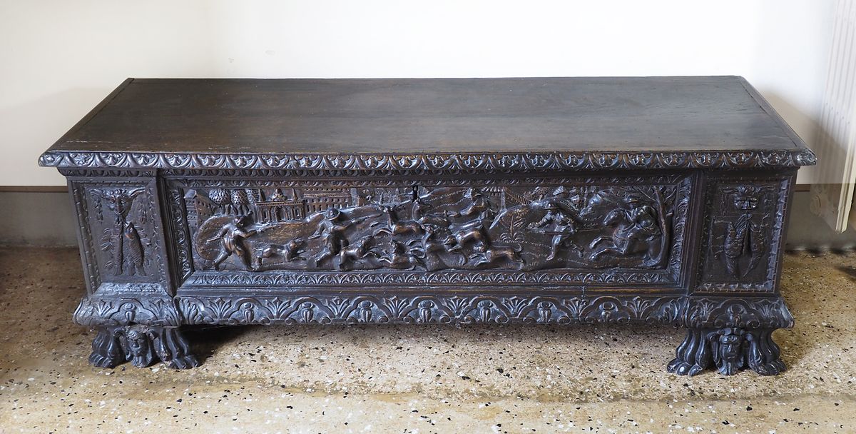 Cassapanca in legno con fronte scolpito raffigurante scene di caccia. Veneto, XVI secolo. cm. 57x160x54.