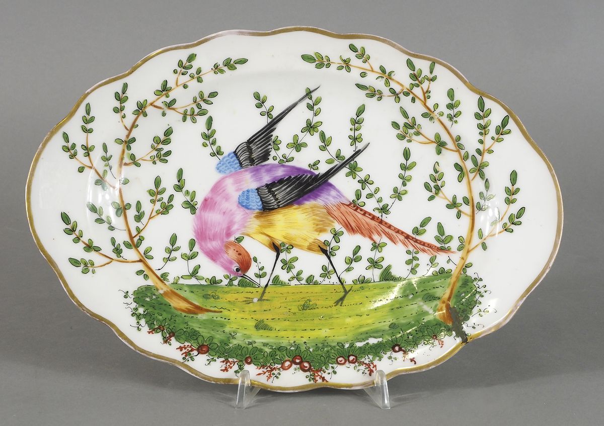 Piatto in porcellana polilobato a motivi zoomorfi. Diam. cm. 30.