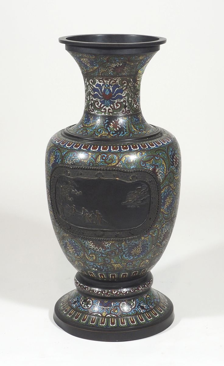 Grande vaso in bronzo con smalti policromi a lavorazione cloisonnè. Cina, XIX secolo. H. cm. 74.