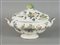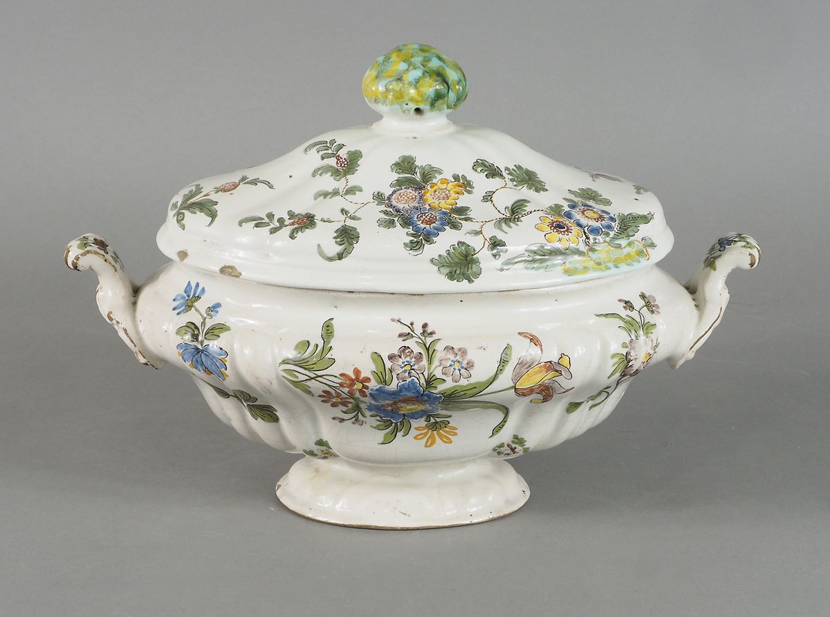 Zuppiera in maiolica dipinta a motivi floreali e tacchiolo. Bassano, XVIII...